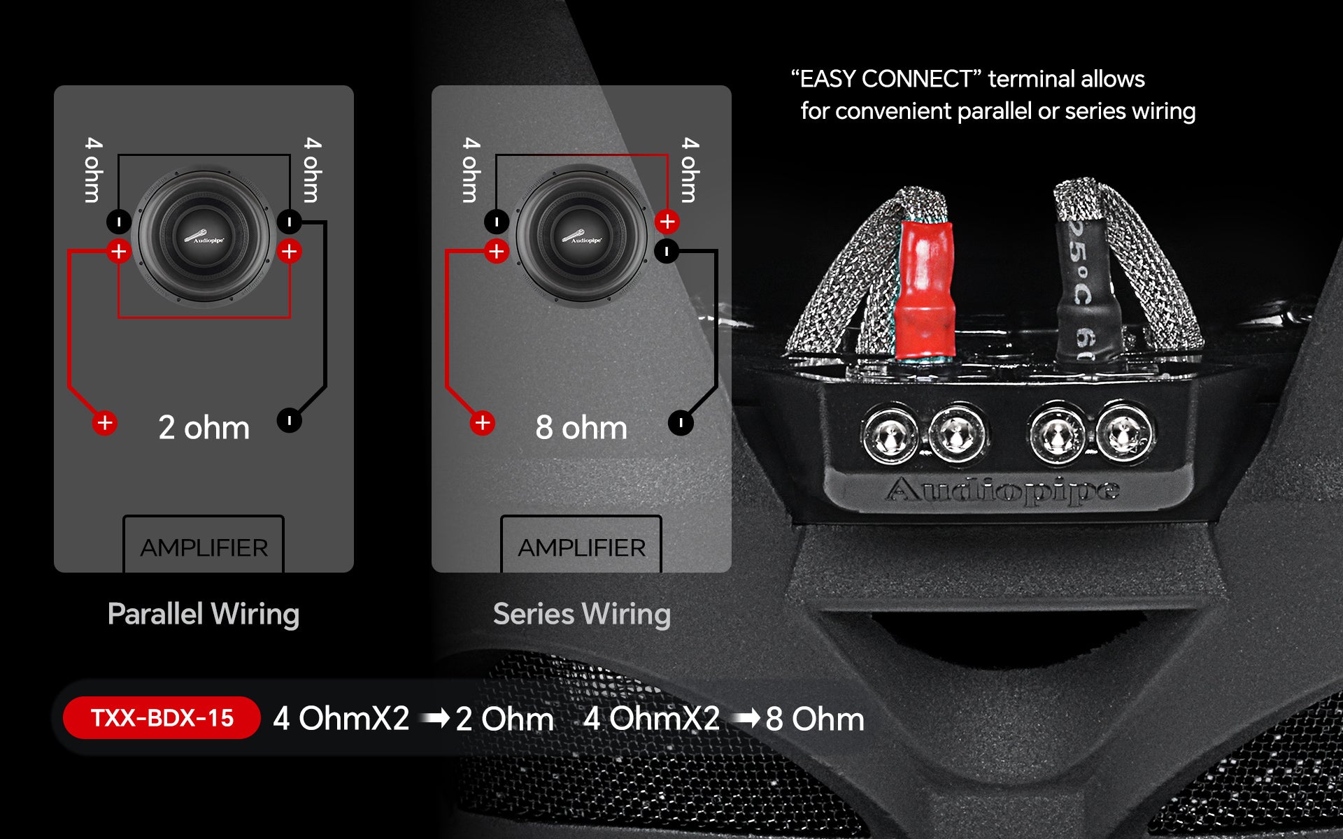 - PATENT PIPE MULTI-CONNECT TERMINALS: The TXX-BDX-15's carefully designed and tooled reliable and convenient patent pipe multi-connect terminals allow for easy wiring of your subwoofer in either parallel or series configurations.