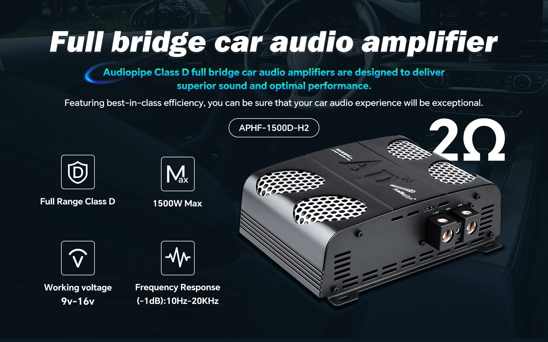 Our APHF-1500D-H2 Full Range Class D MOSFET Amplifier delivers an impressive 1500 watts of clear and powerful professional audio. By harnessing Full Bridge Class D technology, this amplifier can provide more power to the load compared to a single-ended amplifier. Full bridge amplifiers are inherently more efficient, utilizing the entire power supply voltage. Additionally, the APHF-1500D-H2 features a comprehensive four-point protection system, guarding against electrical shortages, overheating, low voltage, and overvoltage. Take control of your audio system from the driver’s seat with the extended Bass knob, while the clip monitor indicator alerts and ensures distortion-free sound. Boost your audio experience with our Full Range Class D MOSFET Power Amplifier!