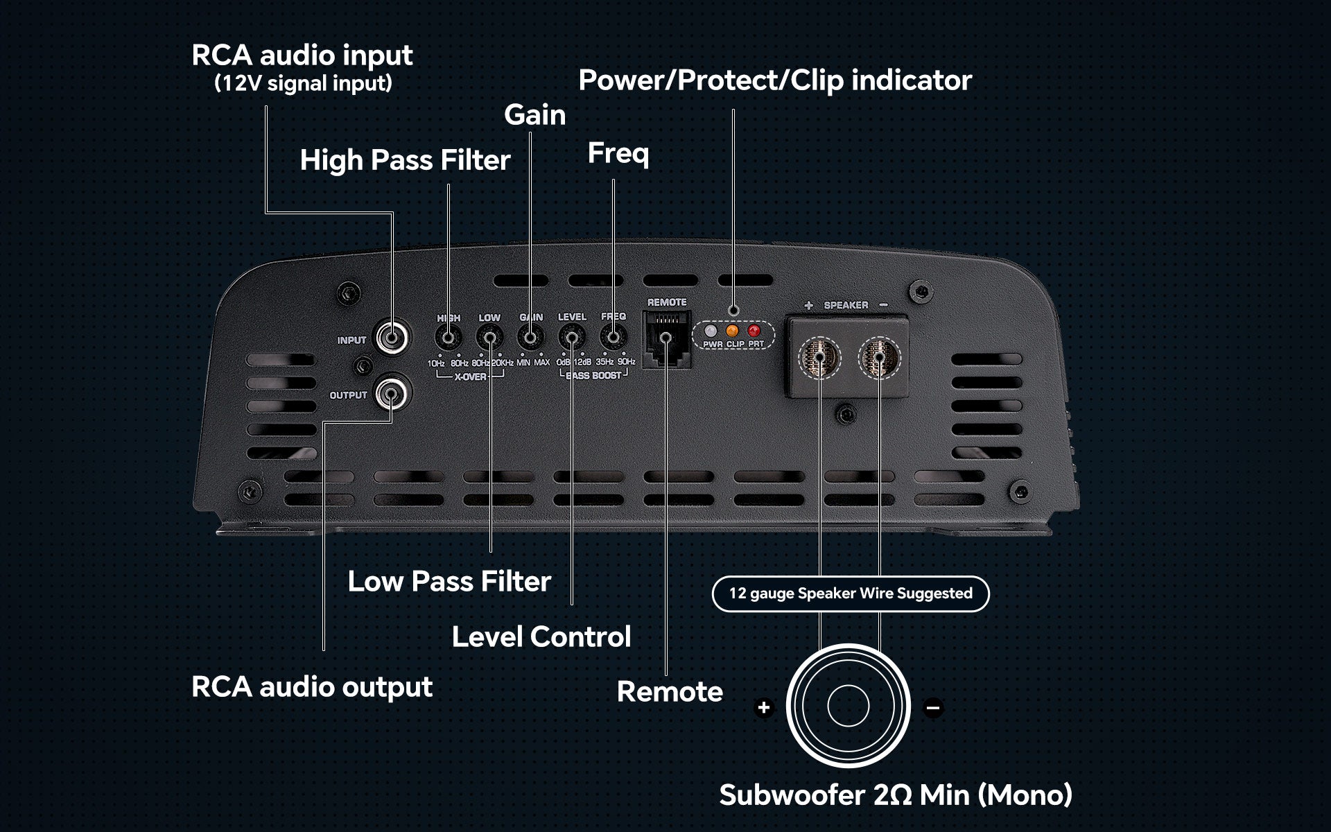 - REMOTE SUBWOOFER VOLUME CONTROL: This amplifier comes equipped with a remote bass control knob, clip LED, and power on/off LED indicator. Easily control your audio sound level and monitor your amplifier's performance.