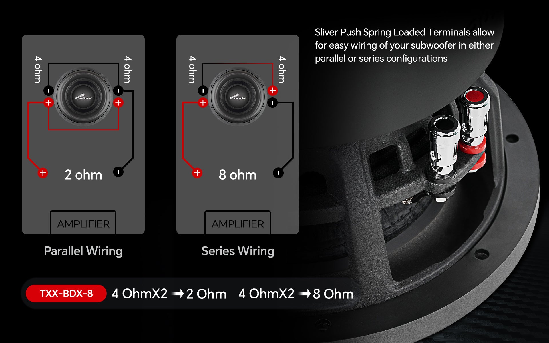 - PATENT PIPE MULTI-CONNECT TERMINALS: The TXX-BDX-8's carefully designed and tooled reliable and sliver push spring loaded terminals allow for easy wiring of your subwoofer in either parallel or series configurations.