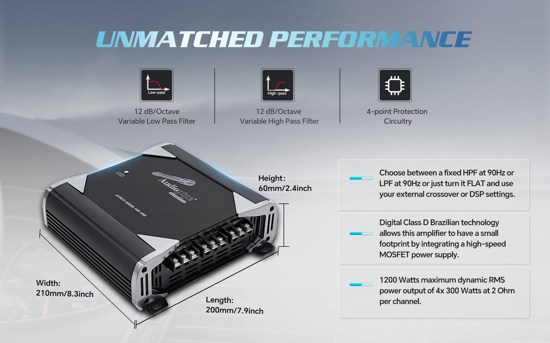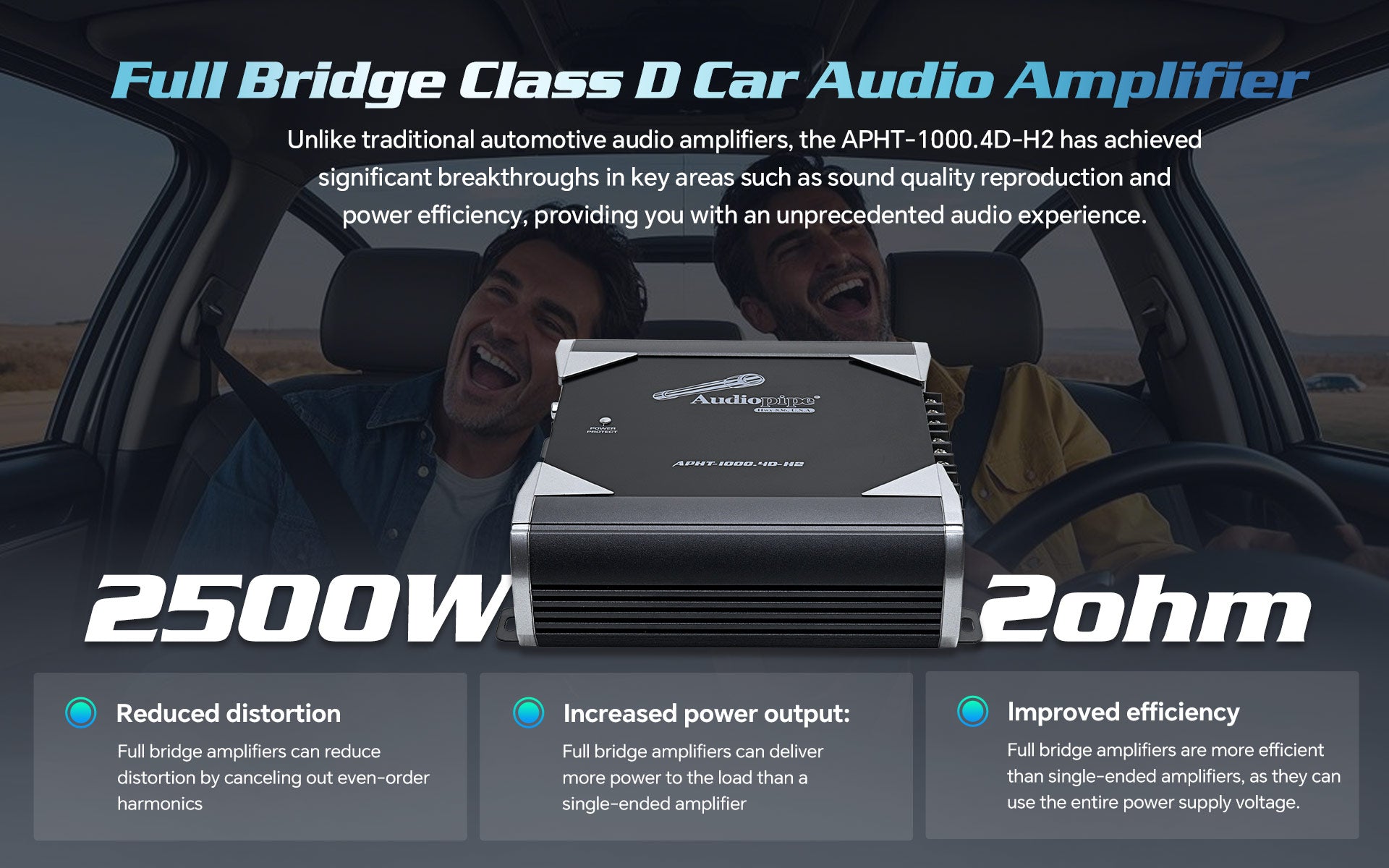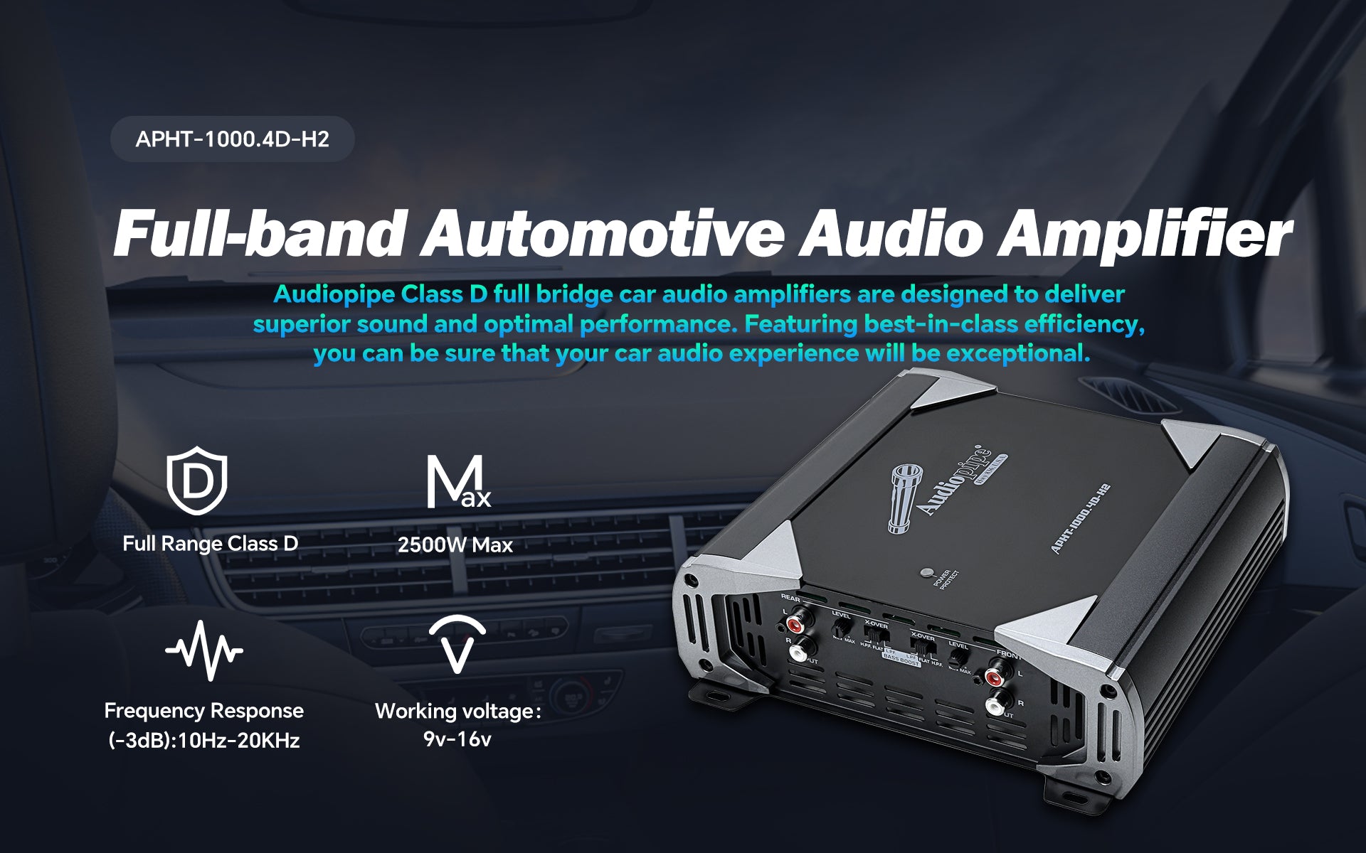 Experience unmatched audio quality with our APHT-1000.4D-H2 Full Range Class D Transistor Amplifier. With 1000 Watts of power and advanced BTL technology, it delivers clear and powerful sound for even the most demanding car audio systems. A four-point protection system and clip indicator ensure safety and distortion-free sound. Elevate your audio game today!