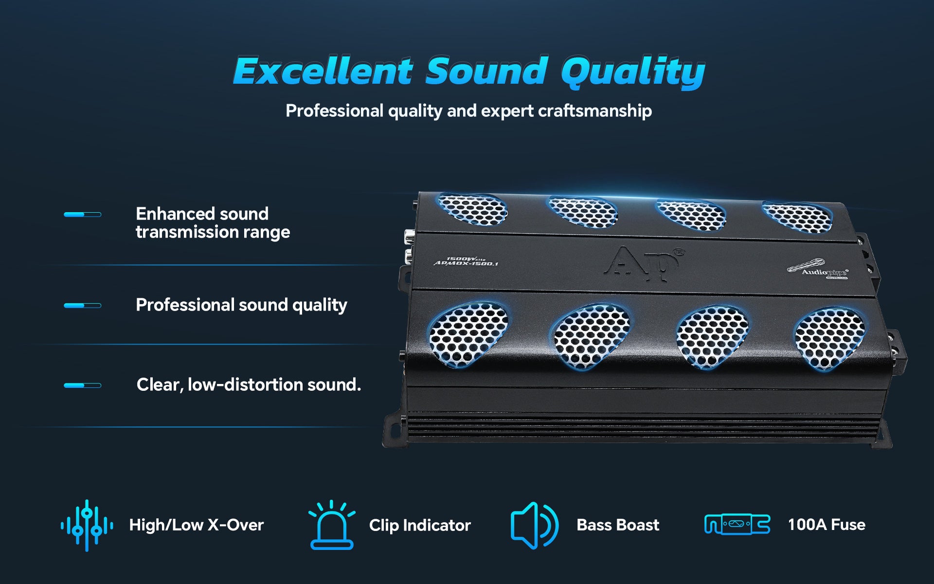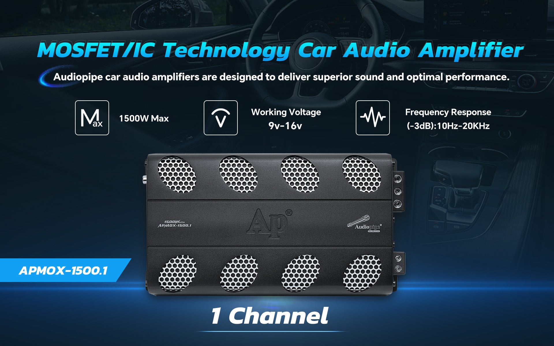 - DESIGNED WITH ADVANCED MOSFET CIRCUITRY: The APMOX-1500.1 utilizes advanced MOSFET circuitry for maximum performance with minimal distortion, making it an ideal choice for your audio system