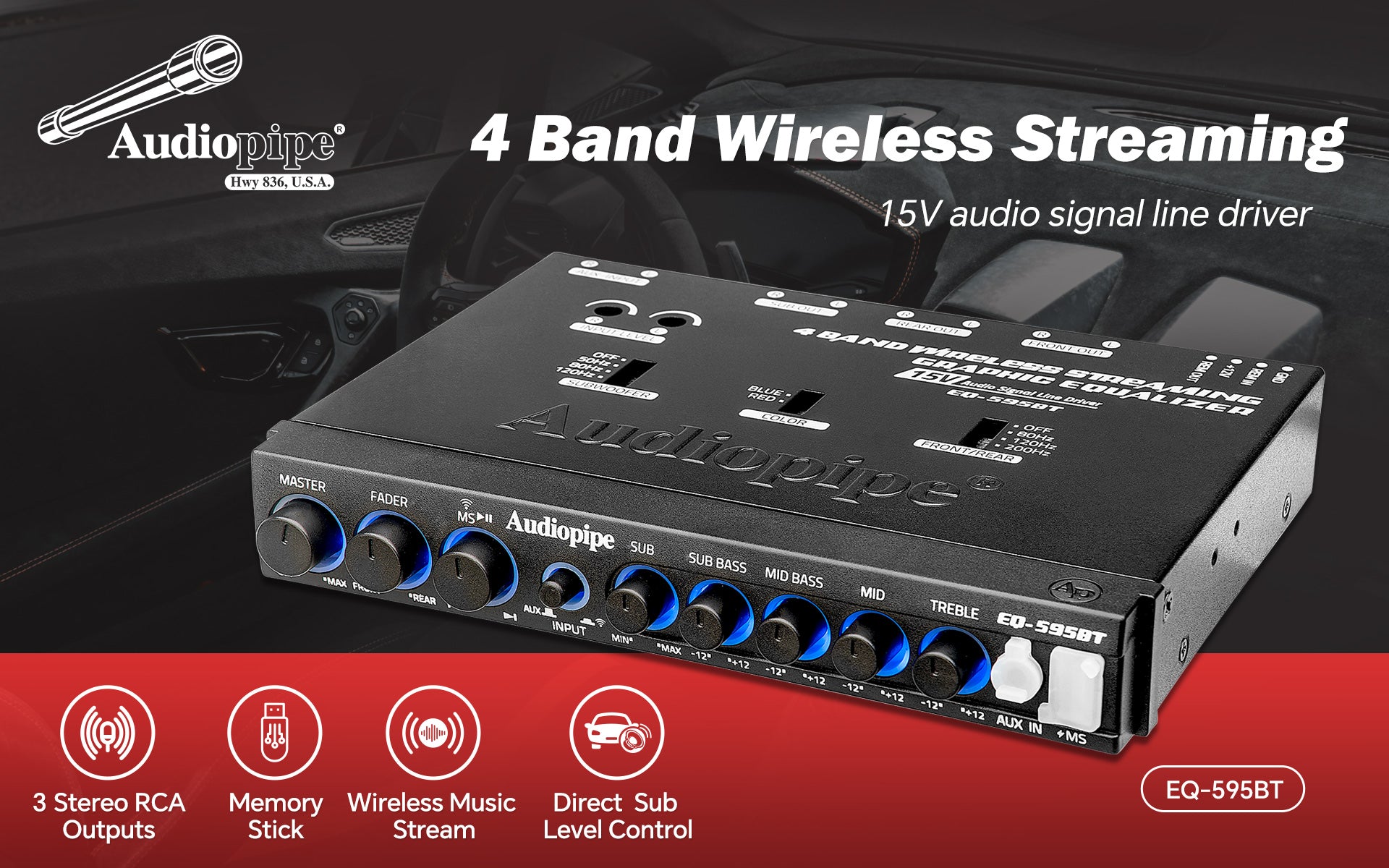 - 4-BAND WIRELESS STREAMING WITH 15V LINE DRIVER: The Wireless Streaming Graphic Equalizer (EQ-595BT) offers advanced control over your audio, featuring 4 distinct frequency bands for precise audio shaping. Including a 15V audio signal line driver, provides a higher voltage signal to connected devices, ensuring clean, undistorted audio transmission, especially beneficial for high-power systems that demand superior signal integrity