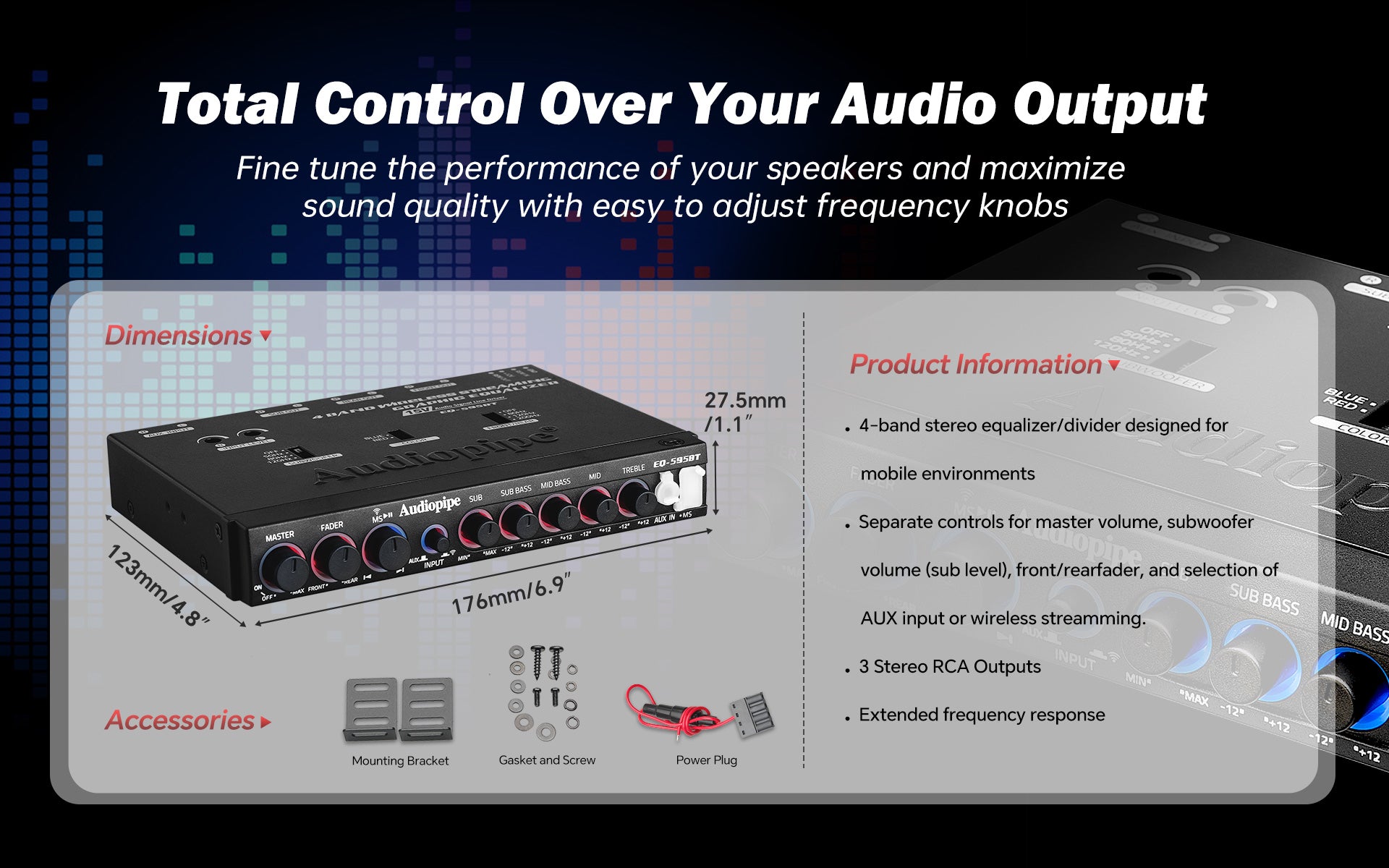 - MOUNTING ACCESSORIES INCLUDED: The Wireless Streaming Graphic Equalizer comes with a mounting bracket, gasket, screws, and a power plug, ensuring that installation is straightforward and hassle-free. These included accessories make it easy to securely mount the EQ-595BT in your system, whether on a dashboard, in a rack, or within any standard audio setup