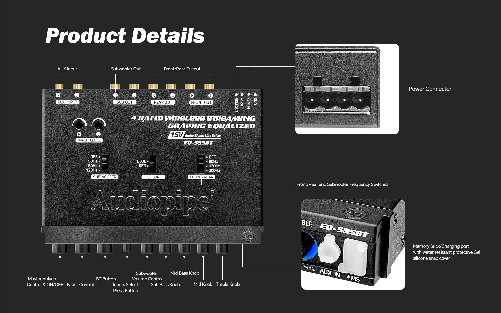 - MEMORY STICK & WIRELESS MUSIC STREAMING: Our Wireless Streaming Graphic Equalizer (EQ-595BT) supports music streaming via wireless Bluetooth and features a convenient memory stick input for easy audio settings or content storage. The memory stick and charging port are protected by a durable, water-resistant gel silicone snap cover, ensuring longevity and protection against moisture